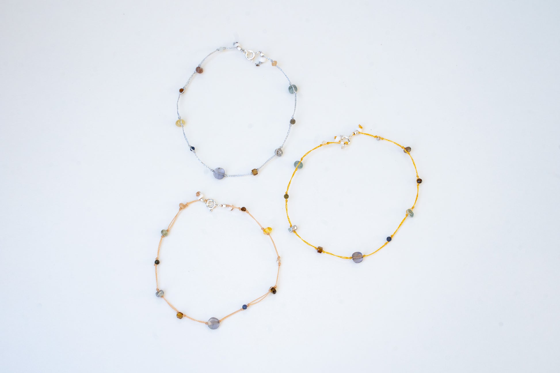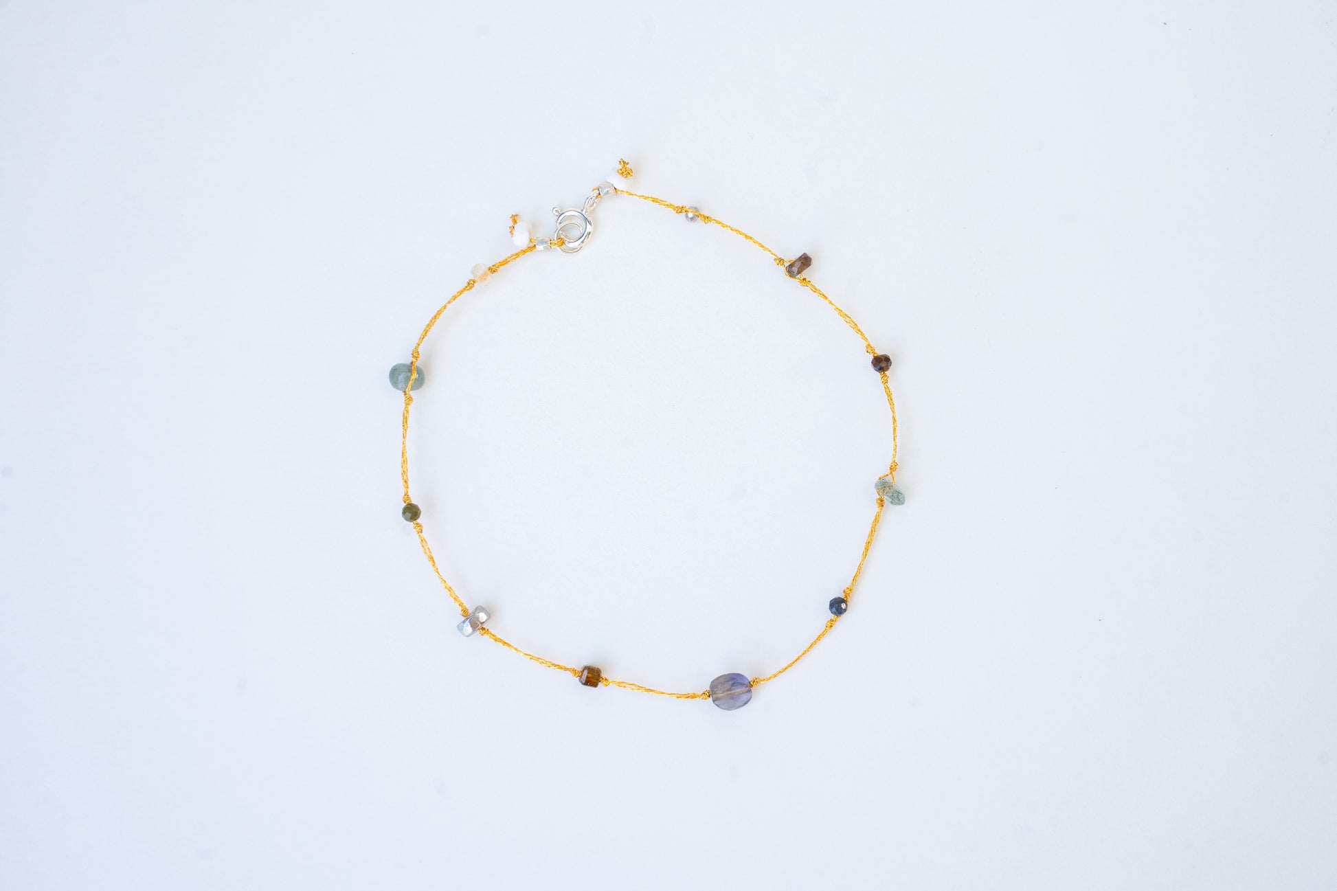Doble nude nylon,7 1/2" adjustable, semiprecious Iolite ,saphire, beryl, tiger eye. andalucite, amazonite,veemake,labradorite, tourmaline, multi beryl, moonstone,
