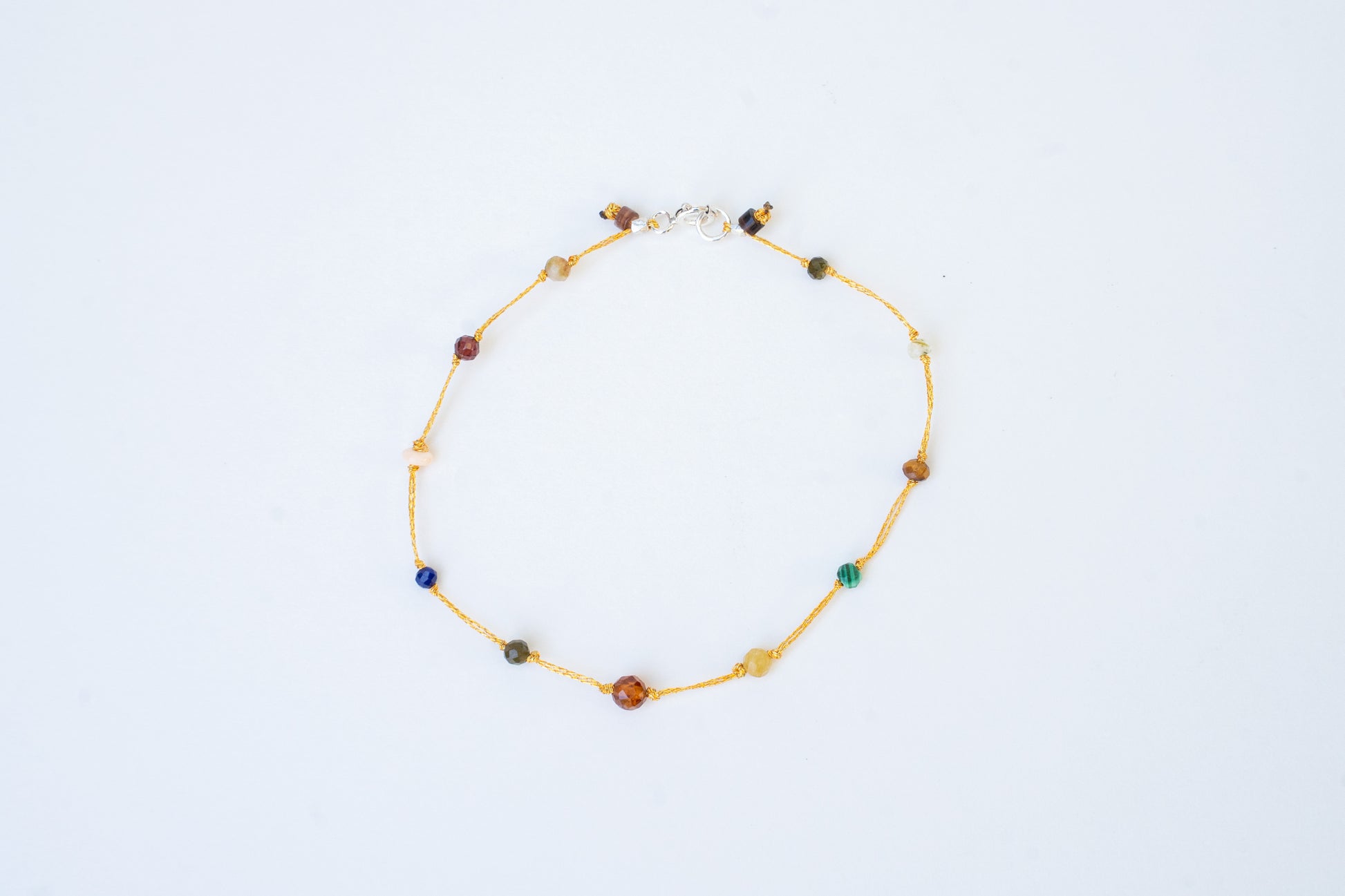 Doble nude nylon,7 1/2" adjustable, semiprecious stones; garnet plum, moonstone, fire opal, lapiz lasuli, tourmaline, yellow opal, malachite, tiger eye, prehenite.