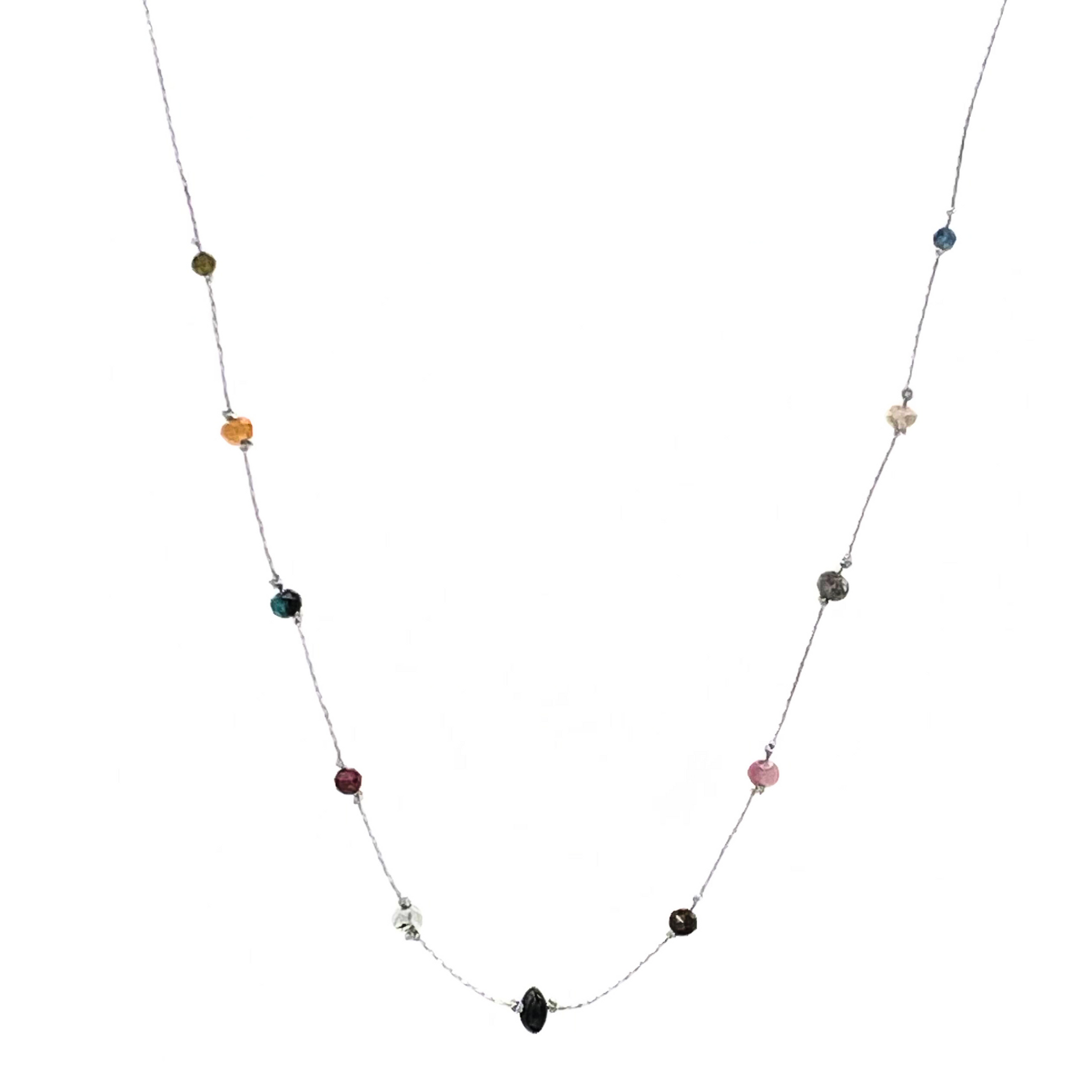 18” silver nylon necklace with a black onyx center, accented by garnet, opal, tourmaline, and colorful stones. Elegant and vibrant