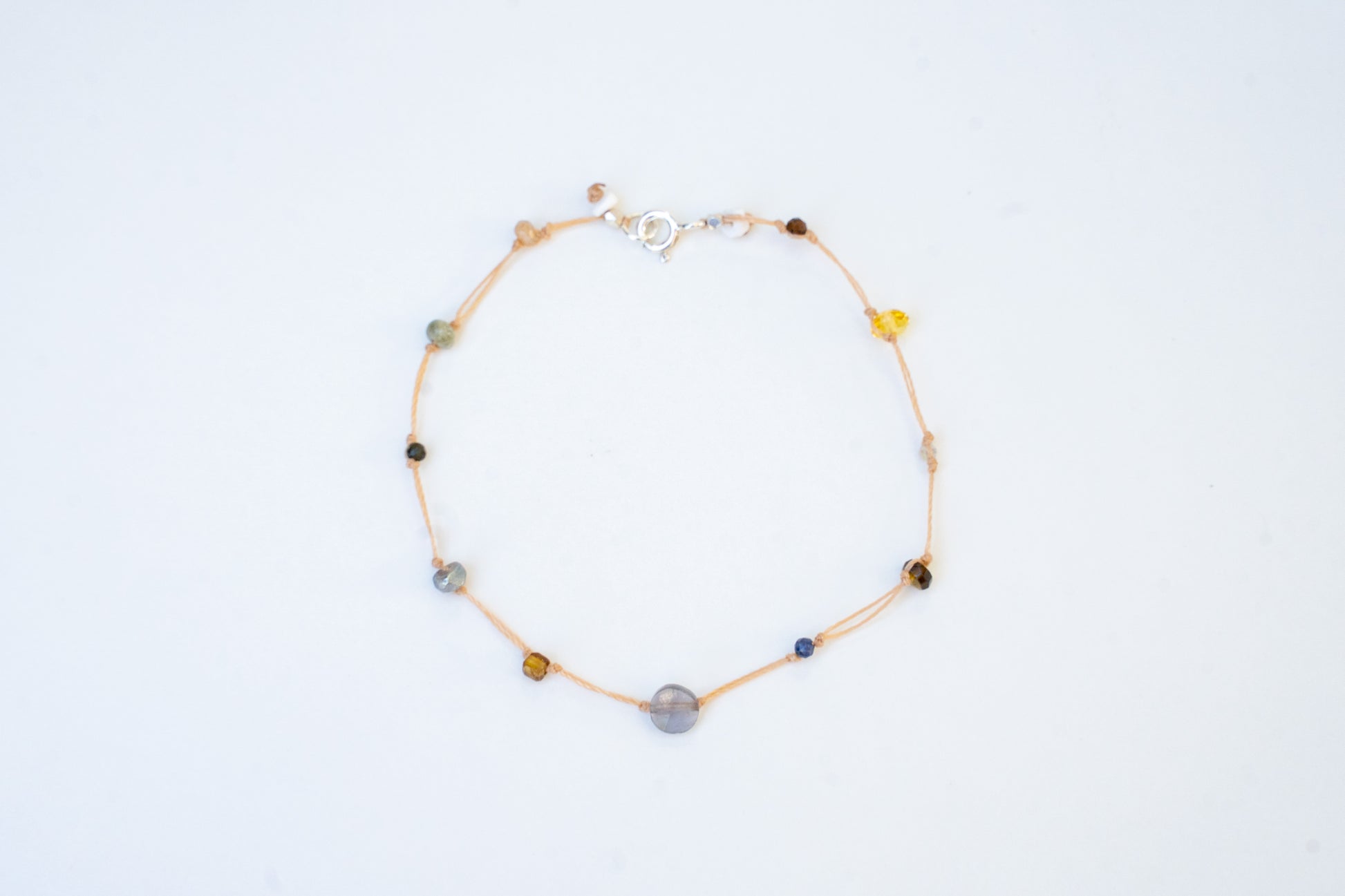 Doble nude nylon,7 1/2" adjustable, semiprecious stones; Iolite ,saphire, beryl, tiger eye. andalucite, amazonite,veemake,labradorite, tourmaline, multi beryl, moonstone.