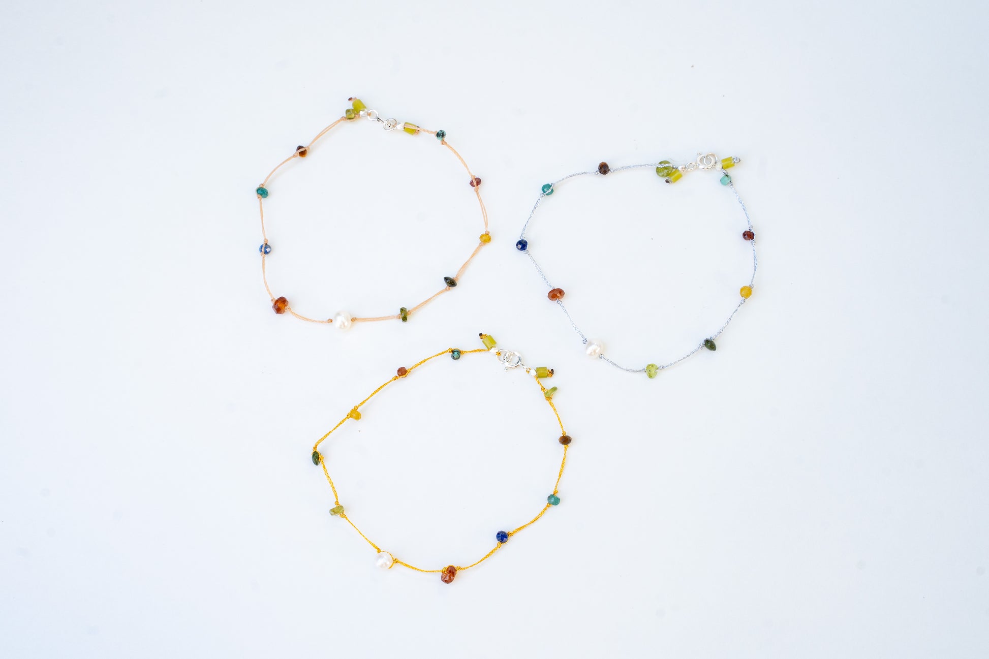 Doble nude nylon,7 1/2" adjustable, semiprecious stones; Cultured freshwater pearls, turquoise, garnet, opals, vesuvianite, lapis lazuli, emerald, and tiger eye