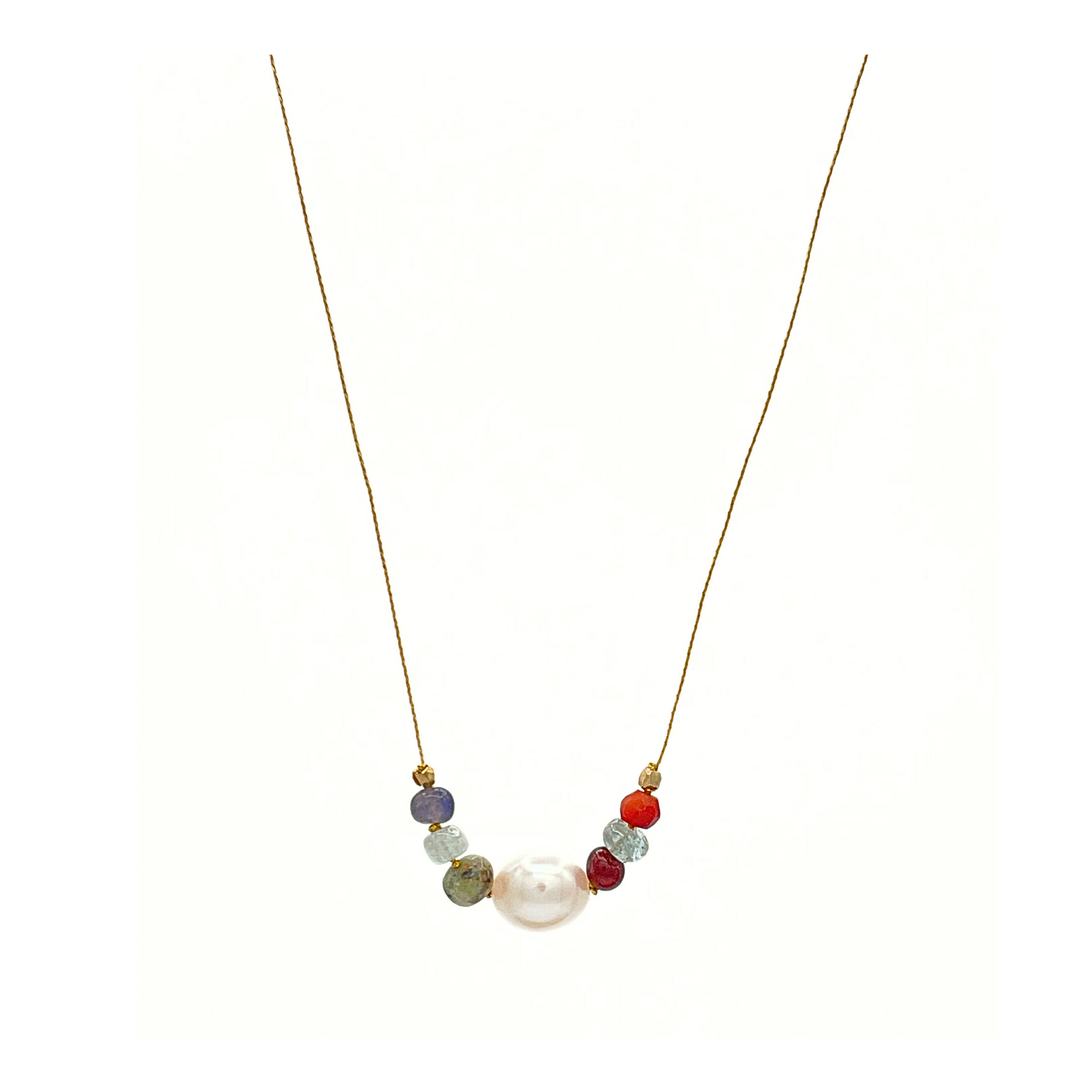 18” adjustable necklace with a central pearl and tropical gemtones. Elegant, radiant, and island inspired