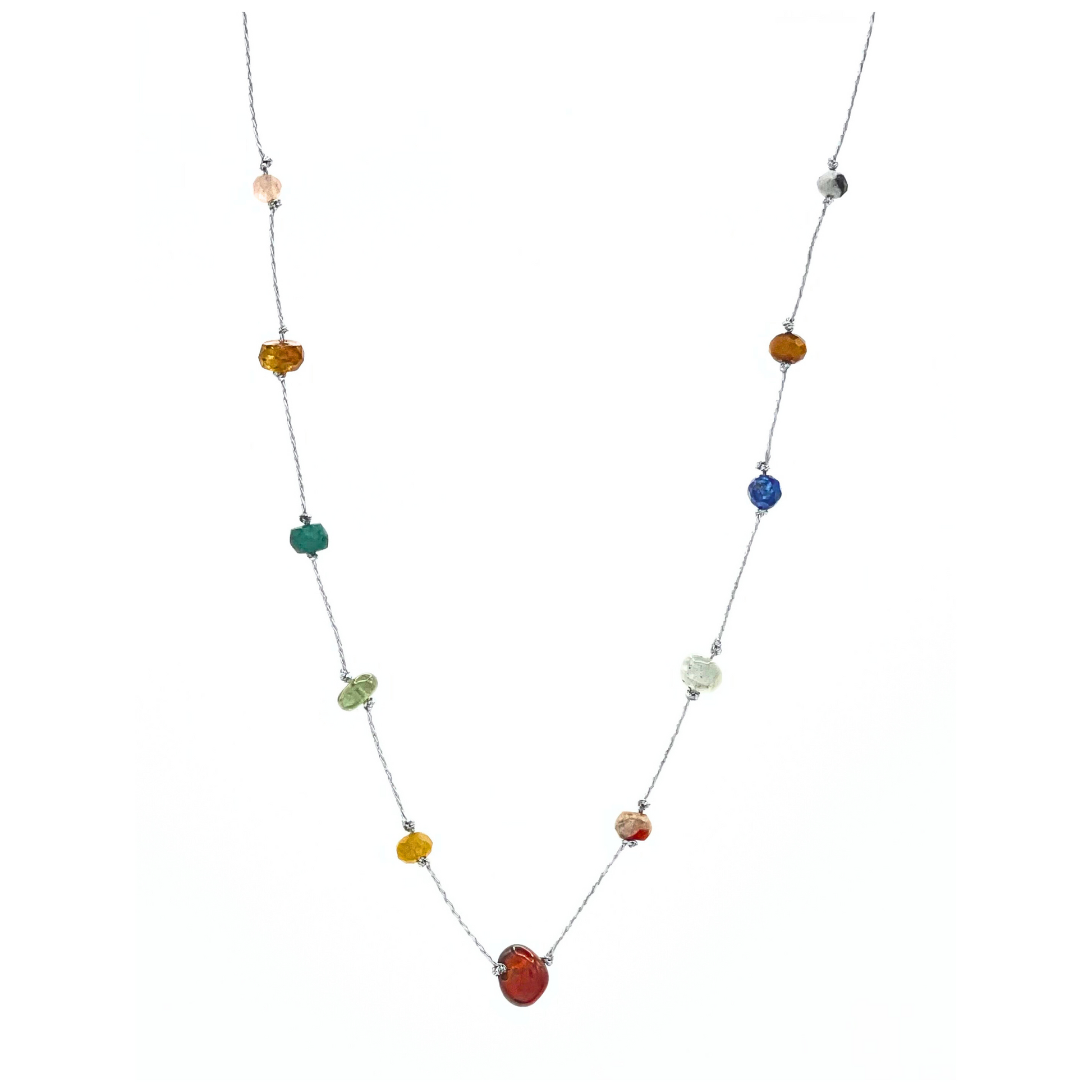 An 18-inch adjustable silver thread necklace adorned with garnet, opal, emerald, turquoise, and other vibrant gemstones. Inspired by tropical beauty, this piece adds a pop of color and elegance to any look.