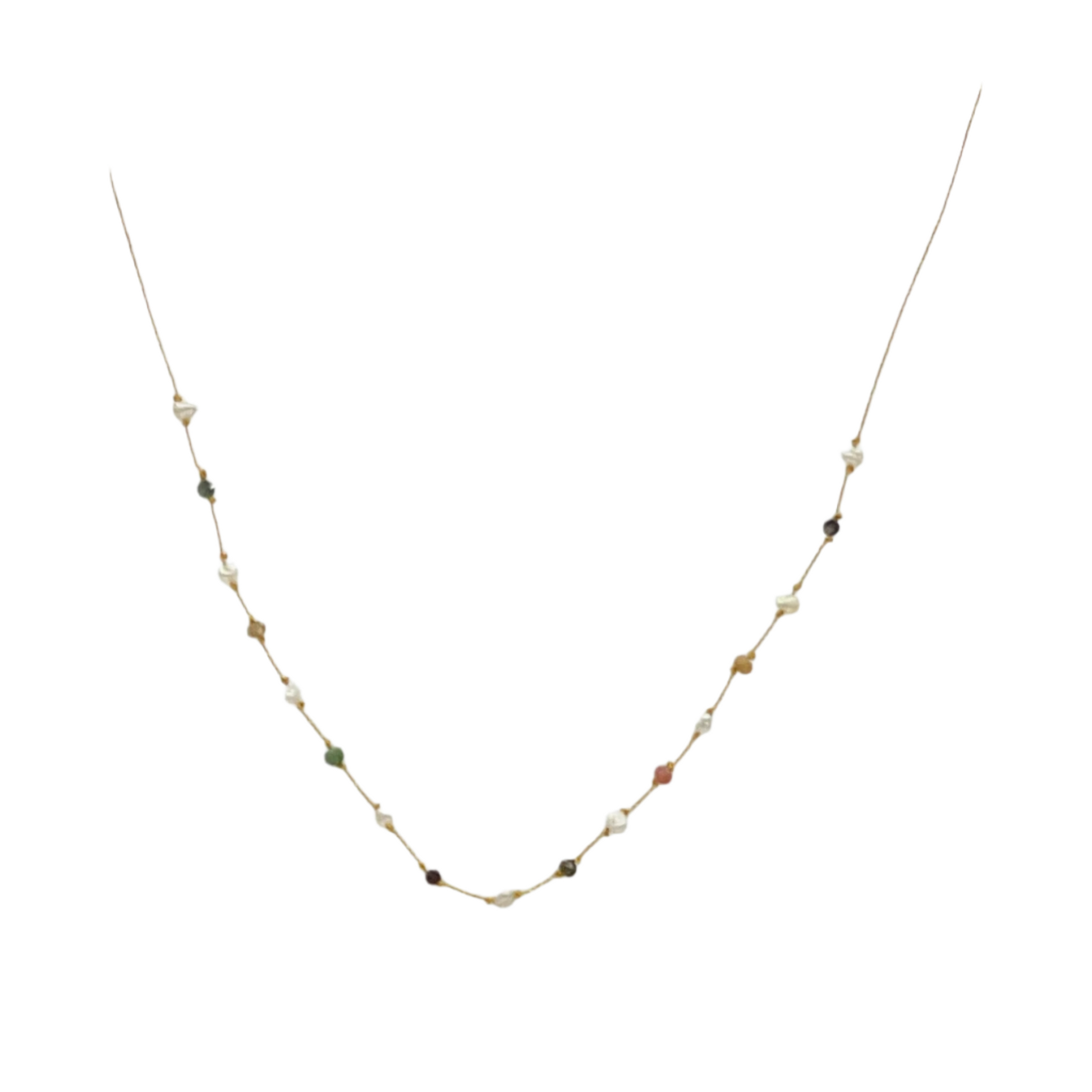 . This 18" adjustable necklace features a 2.5mm natural pearl, reminiscent of a precious treasure from the sea, paired with the vibrant hues of tourmaline. The adjustable length ensures a perfect fit.